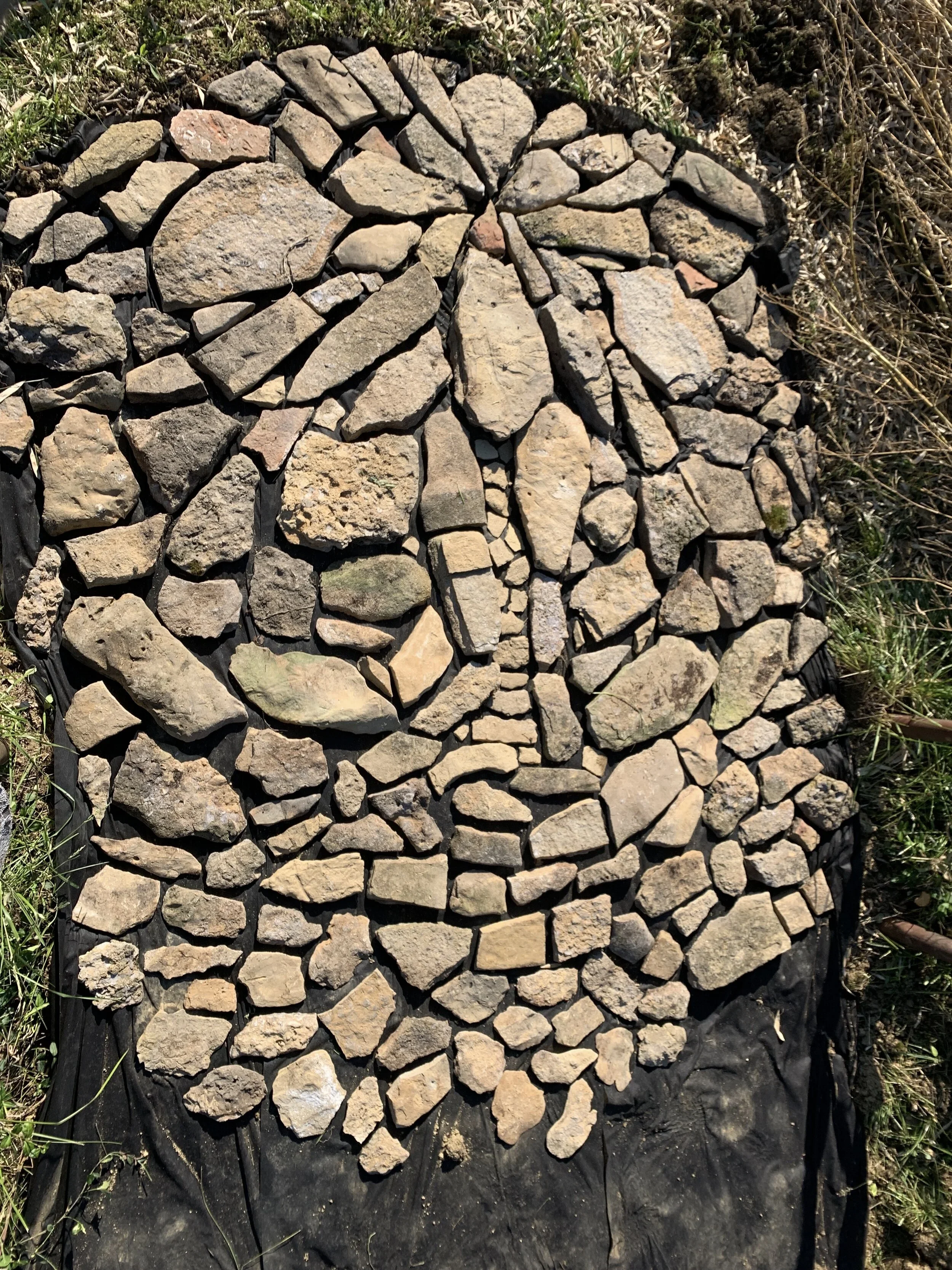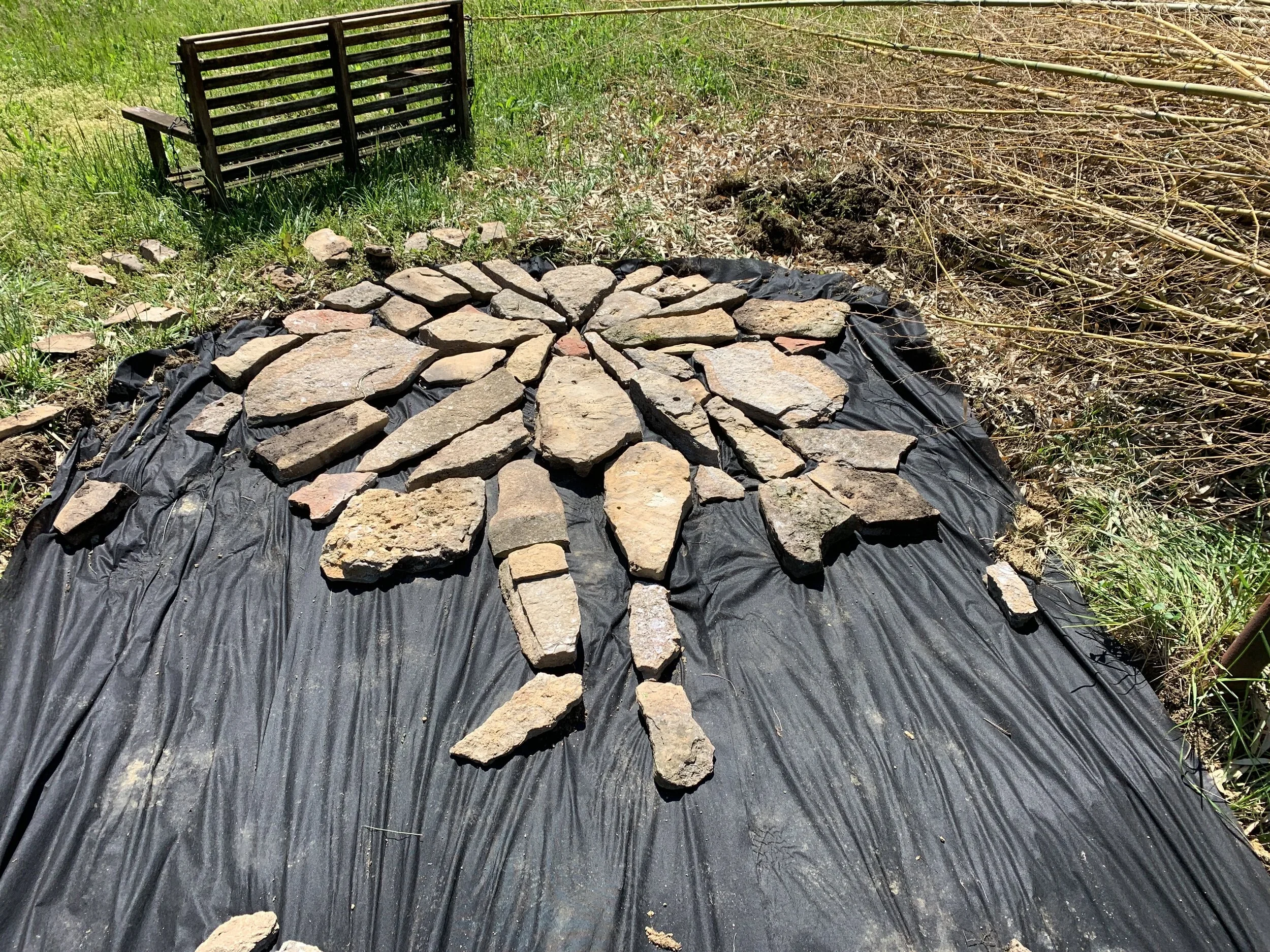 (Toe-stubbing stones of all heights (continuing to follow the, “use what you have” during this time of pandemic), which will lay beneath the salvaged porch swing, a reminder of the importance of remaining connected to our hearts, in the center)