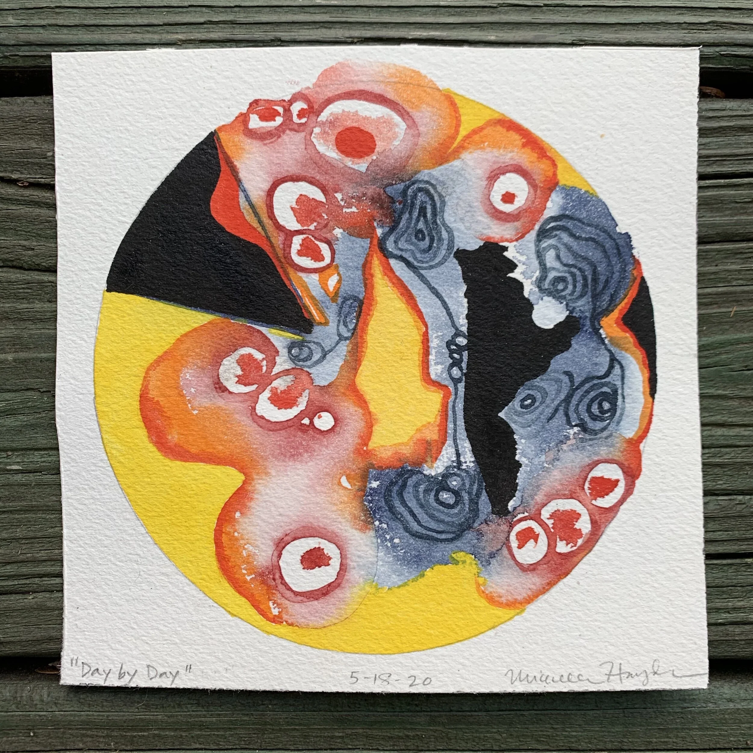 The circle, below, was painted a week before the hate crime that took George Floyd's life, as expression of the ongoing growing pandemic. As I now look on it, I see the wider context of unrest, unlearning, and unity that is growing as we mobilize to create a more equal and just world, facing the encompassing darkness in our nation's history that is only beginning to be acknowledged, yet alone, repaired. But there is light, emerging...