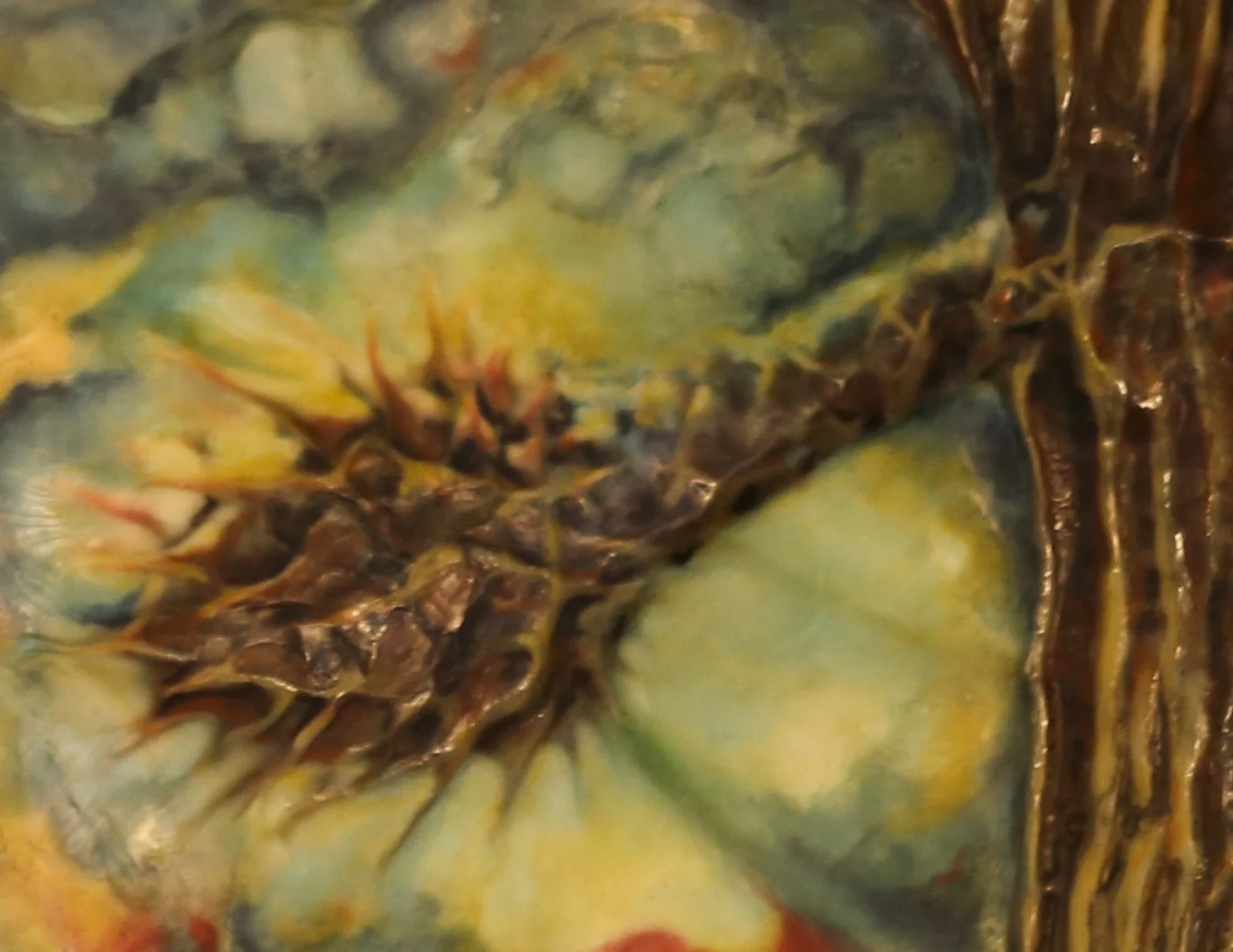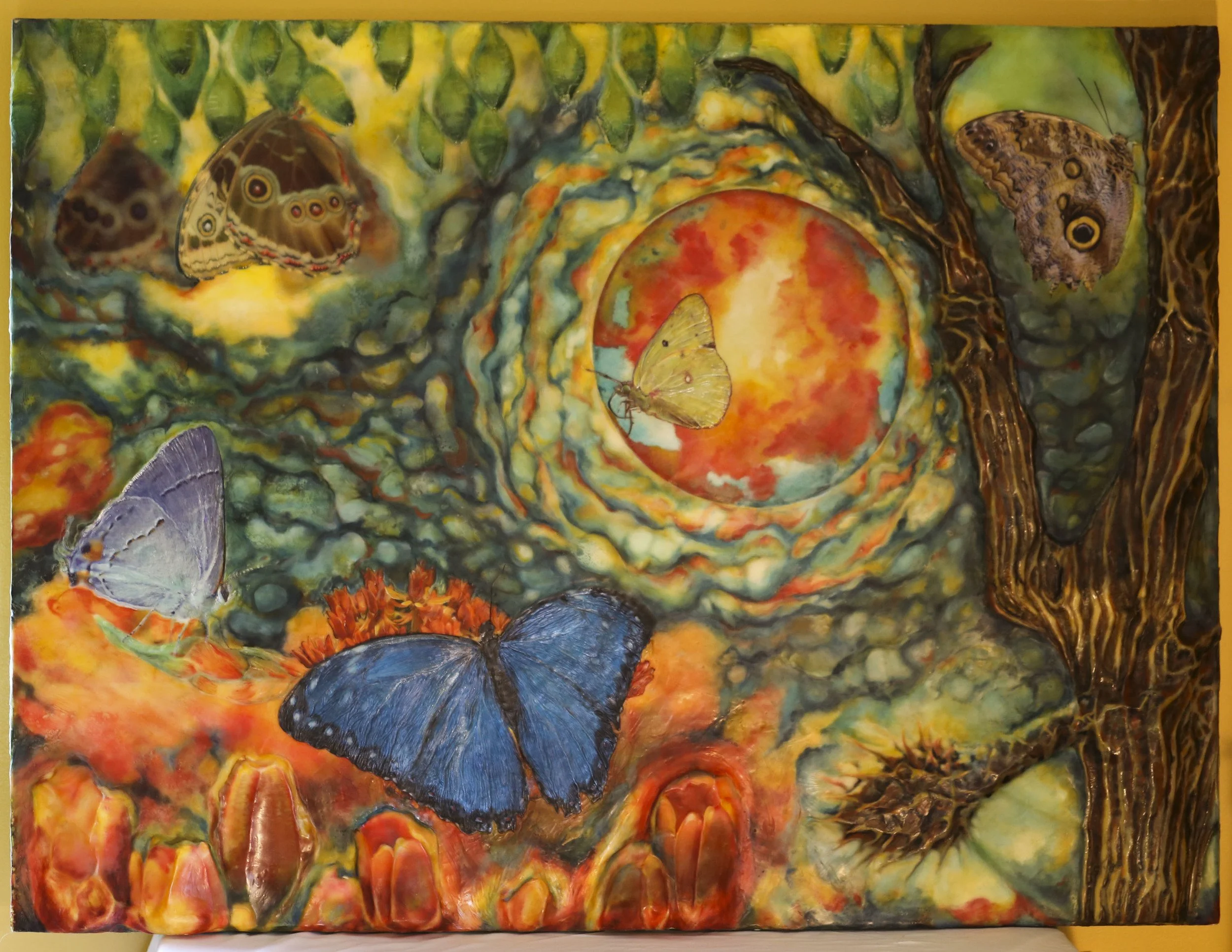 This is the largest piece I have yet made, and the first in which I incorporated encaustic sculpture into a 2D panel. I worked with collaging multiple images of my macro photography, coating them all with many layers of encaustic, hand-coloring them, carving relief work, and then fusing them into the overall composition. The pinecone, tree, chrysalis, and butterfly weed all protude out of the panel in many directions, adding a new depth of interest. This idea struck me well into the making of the piece, making it very challenging, as I had to take a razor blade to composition that was already fused down, and remove it in order to sculpt it and fuse again. At some point, I had to stop myself from excising each image in the collage, realizing that enough was enough :). That is the nature of experimentation and progression with any piece, eh? It is always hard for me to stop, knowing that a work is ready to come to a resting place.