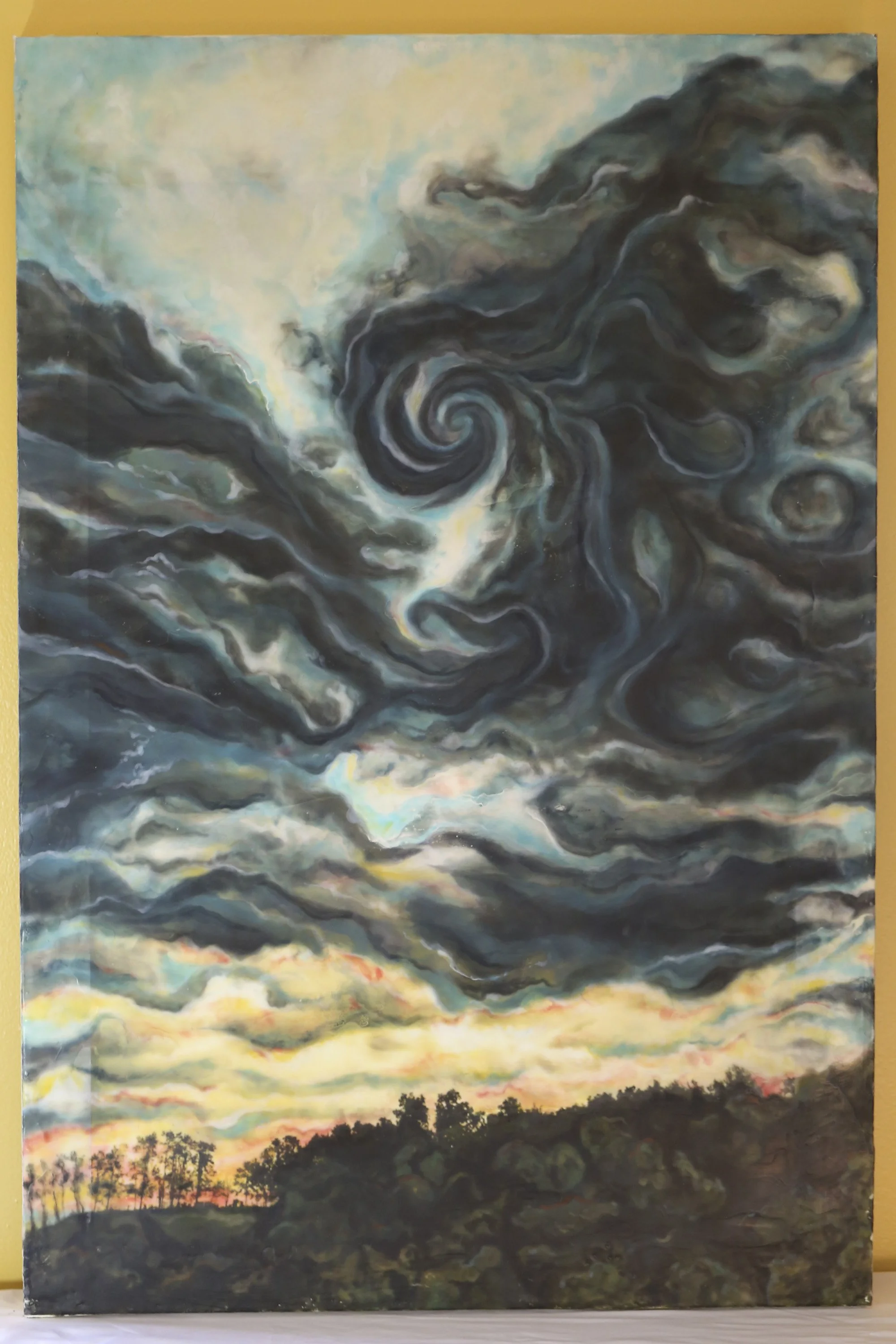 This piece was made from a photograph that I took one morning while doing yoga during a clear and still sunrise. Out of nowhere, a massive series of storm clouds appeared from the north, and I was completely taken in by what evolved in the next 20 minutes. The sky changed in such rapid fashion that I could think of nothing else, and was drawn into the power of nature, and of its force and ability to overtake any moment. Although a funnel cloud developed and started to drop down shortly after this picture was taken, it was quickly reabsorbed into the surrounding configurations. I felt such gratitude to witness to this breath-taking beauty, as well as to be safe. I pondered how nature mirrors our own lives, which can change on a dime, and how we can use these metaphors for inspiration, validation, and comfort when our own circumstances need balancing.