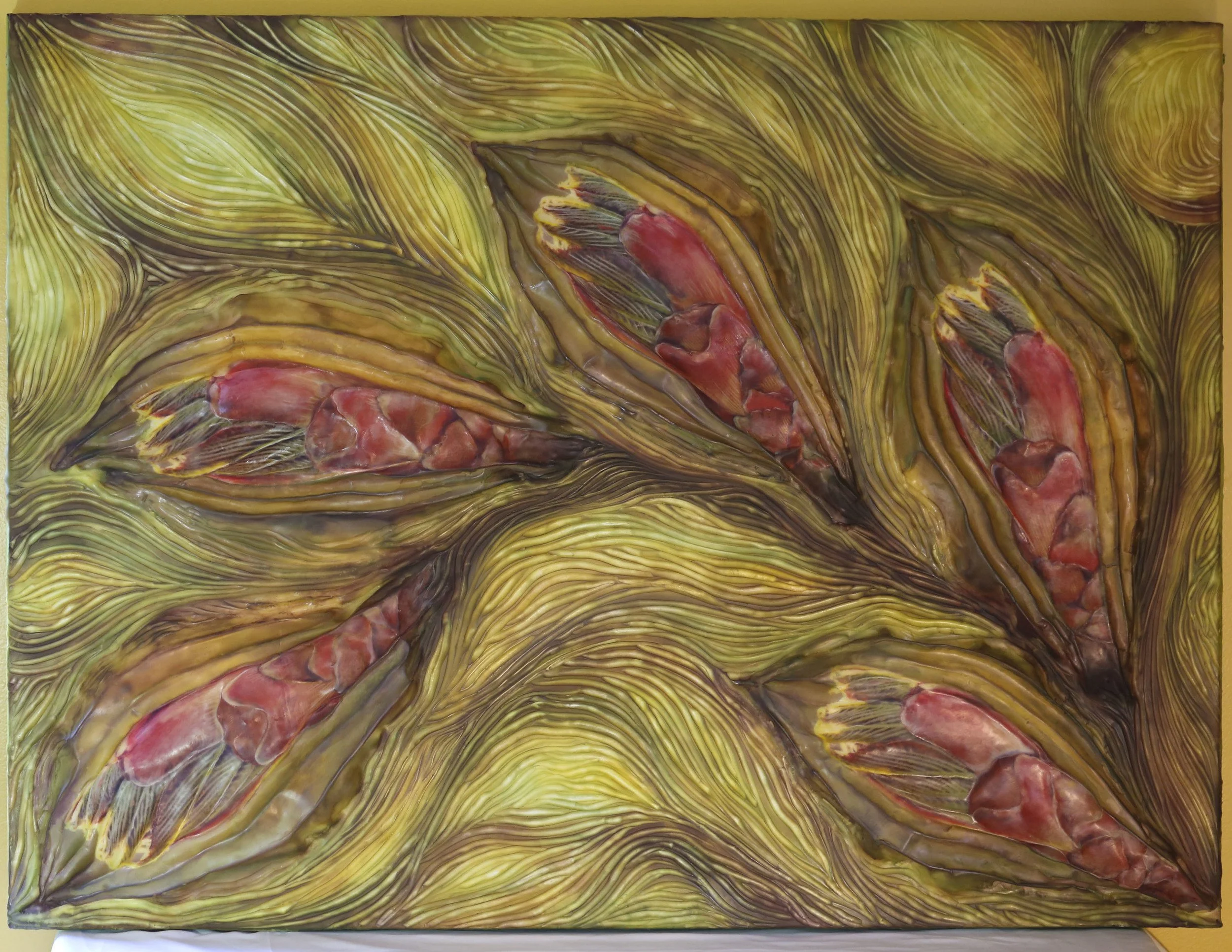 This is the second panel piece I made which incorporates sculptural work, and this time, it was planned from the beginning :). There is much detail drawn into the opening buds with colored pencil, and the background was covered with almost 1/4" of beeswax (that is a lot of layers!), and then hand-carved in an organic and intensive process. I love carving this way, even though my wrists do not! The ensuing lines remind me very much of wood-cuts, of which I have always had an affinity. I am always moved by elements in a piece that show the journey of the making. It reminds me of how our lives unfold, and how we travel many different paths that lead to who we are, uniting to make us more whole and deep. The buds were taken in late February of last year, at a wonderful nature preserve in Berea, KY, Anglin Falls, which is one very magical place...