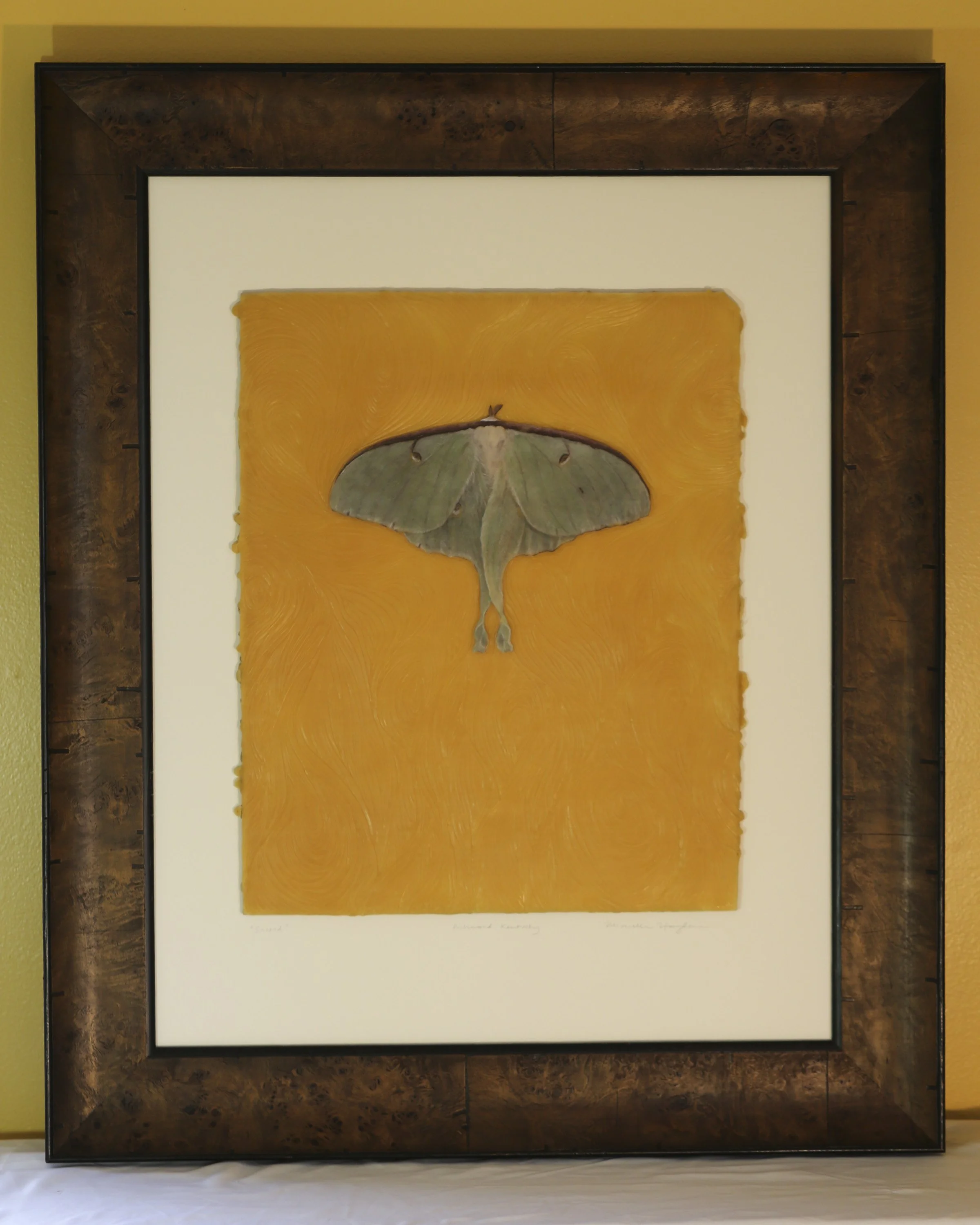 This was the first experimentation with hand-carving the background. I love the flow which emerges as the carving unfolds, as it seemed like a good background for such a frozen moment in time. I found this luna moth in my driveway one morning after an early pre-dawn run, outlined by the soft light of the street lamp. I was surprised she was still there, not having been consumed by the night creatures that often use the lure of light which draws many winged ones in the dark of night. The luna is such a divine-looking moth, and I am always reminded of the fleeting beauty in life when I come upon them, as they live for only 5 days. It makes me reflect on how I would live if I knew that was the amount of time I had to exist on this plane. I so appreciate that photography exists to enable the preservation of these moments and experiences in time.