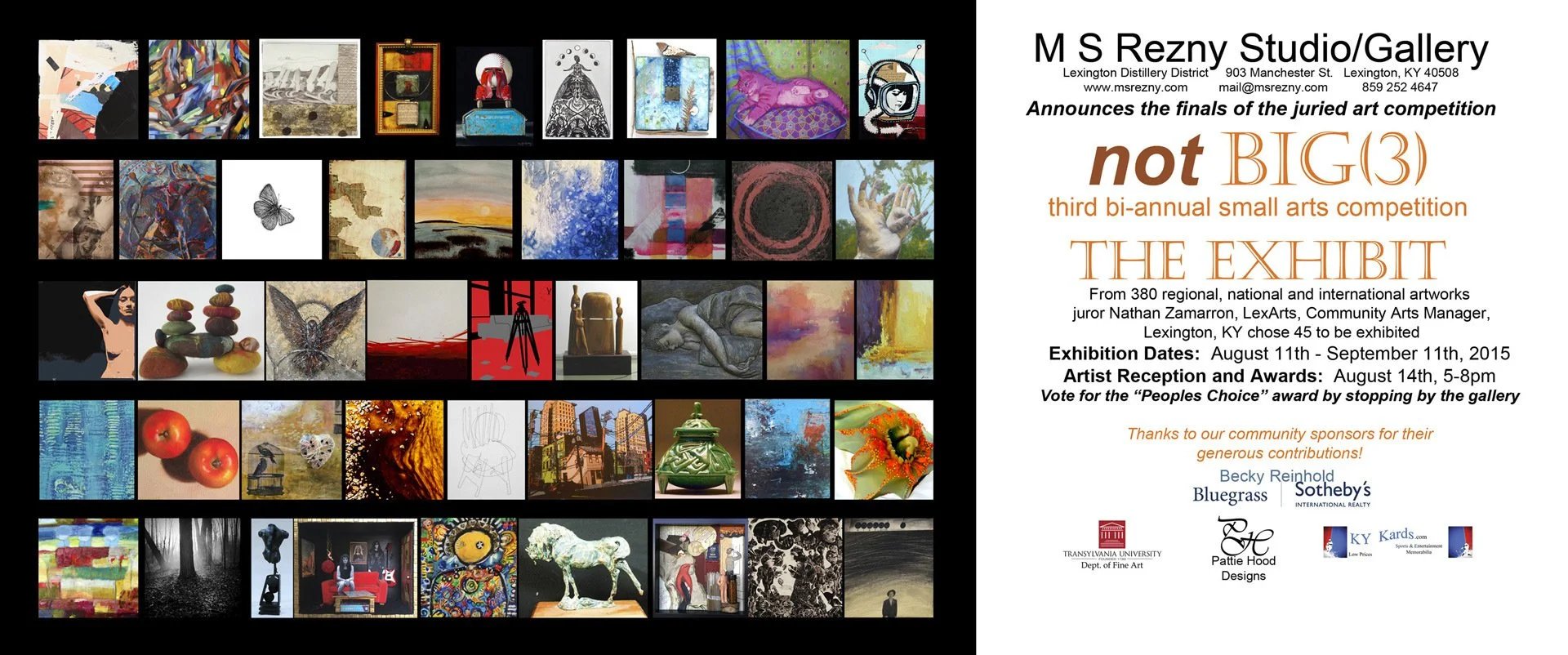 M S Rezny Studio/Gallery is pleased to announce the finals in the national/international small arts juried competition notBIG(3) The Exhibit. There was no intended theme for this art competition; the only requirement was that the artwork had to be 12”x12” or smaller, including the frame. 128 artists from 28 states and 6 countries submitted 380 artworks for consideration. This year’s juror Nathan Zamarron, LexArts, Community Arts Manager, Lexington, selected 45 artworks to be in the exhibit. “While looking through the works I saw a vast array of aesthetic and approach to art making. The variety of media and subject matter made the selection process fun and engaging as well as challenging.” Although the work may be small in size, it is big in content.