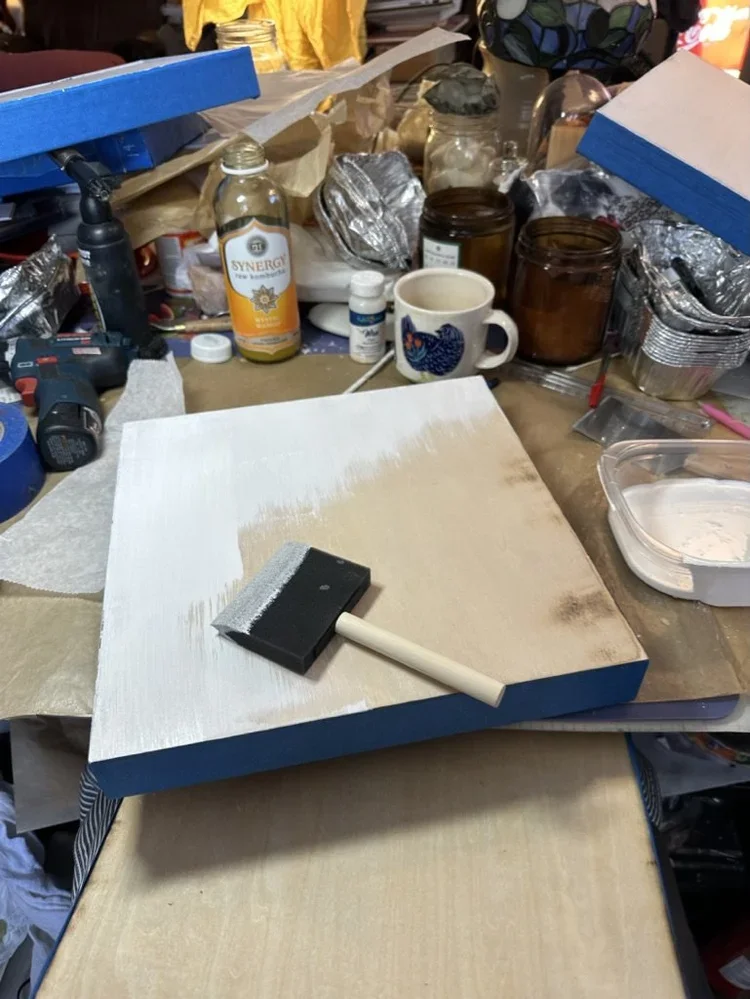 (Not pictured… the other 9 cradled panels, 12 flat boards, and 3 circular panels being primed— the area around me was as treacherous as the over-filled table!). This is the truth of working in an art space that occupies the corner of the living room. Thankfully, all 3 cats avoided the area (a rarity)!.