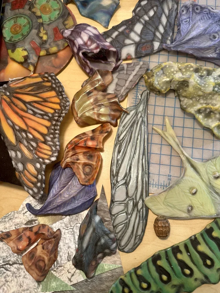 Speaking of art— I am delighted to say that I created some new art space in a void that opened up in my home. I recently acquired an old glass display case to store my works in progress and keep them safe from the jaws of my kittens, haha, and placed a vintage tabletop from a nearby college over the glass countertop, and ta-da— a wide open workspace now beckons (away from the clutter of my other workspace :)). I literally walk by it every time I let the dogs out and love how it calls to me, begging me to work! As I unpacked many bits and bobs stored away in little boxes, new potential unfolded as each took residence on the table. Some of these were started ten years ago!