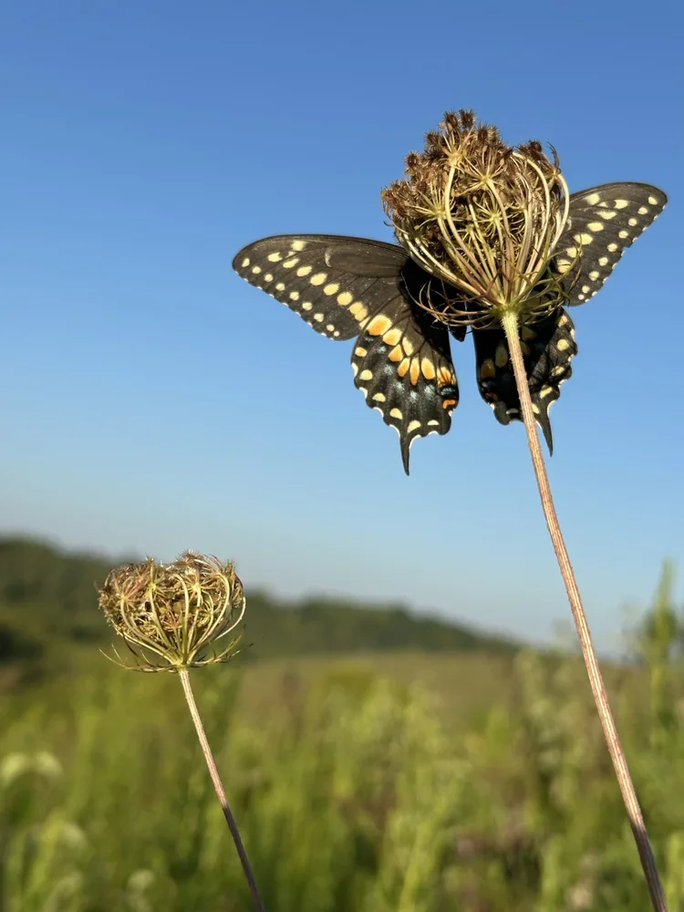 The colors have softened across the hills, glowing in the early morning sun as only the long light of autumn can illuminate… This gentle light is one of my favorite things about fall, and goodness knows, we could all use more gentleness! I came upon this beauty drying her wings in the warmth of the rays, patiently watching me as I watched her. Simple gifts, indeed.