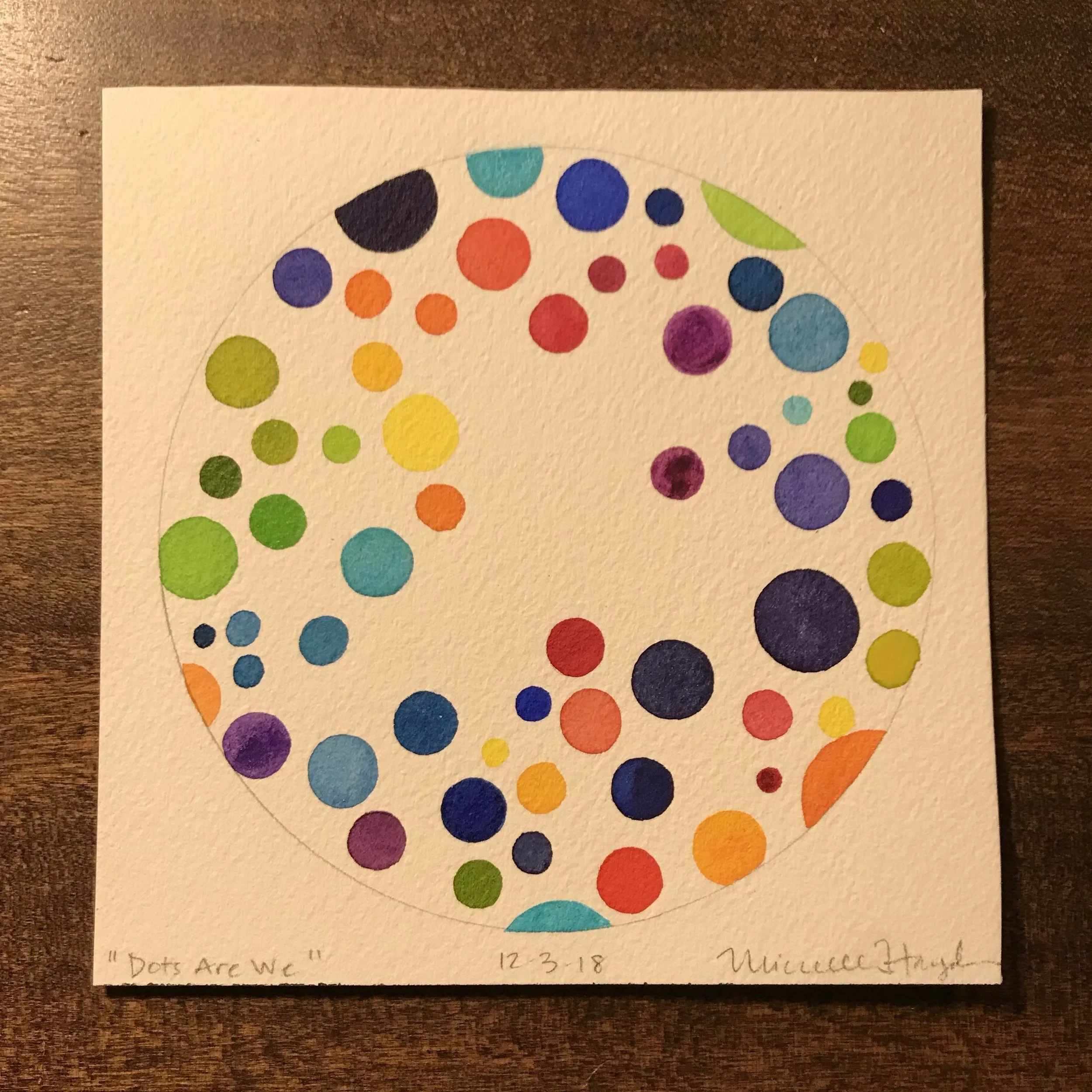 “I always think dots are going to be relaxing and mindless— until I paint the first one and remember that is when made with crayons. Nevertheless, I sank into the rhythm of making one after the other, soothed by knowing the colors of the rainbow that began to fill the page. I thought much about the diversity each of us beings to life and how we are all connected to one another, whether or not our edges ever touch...”
