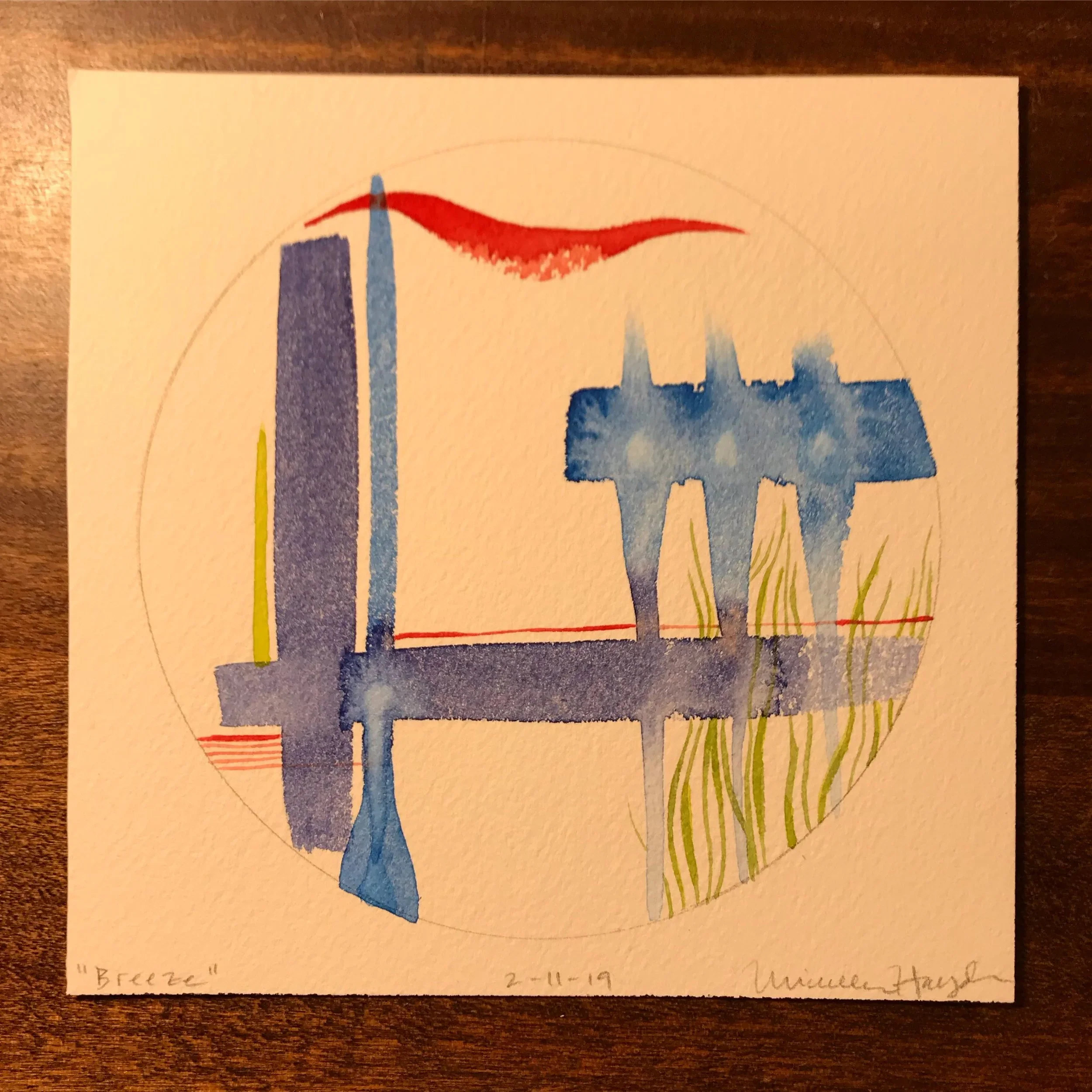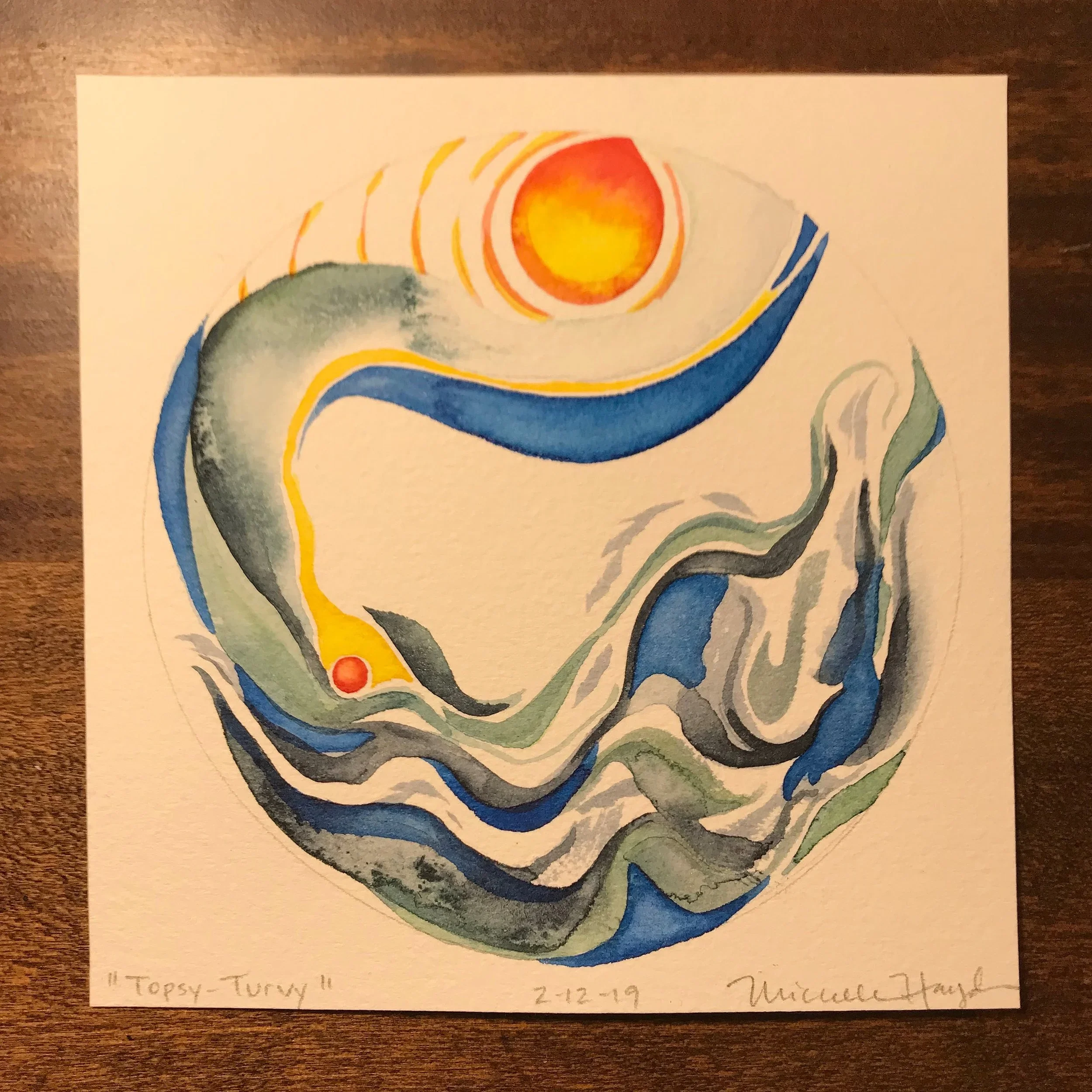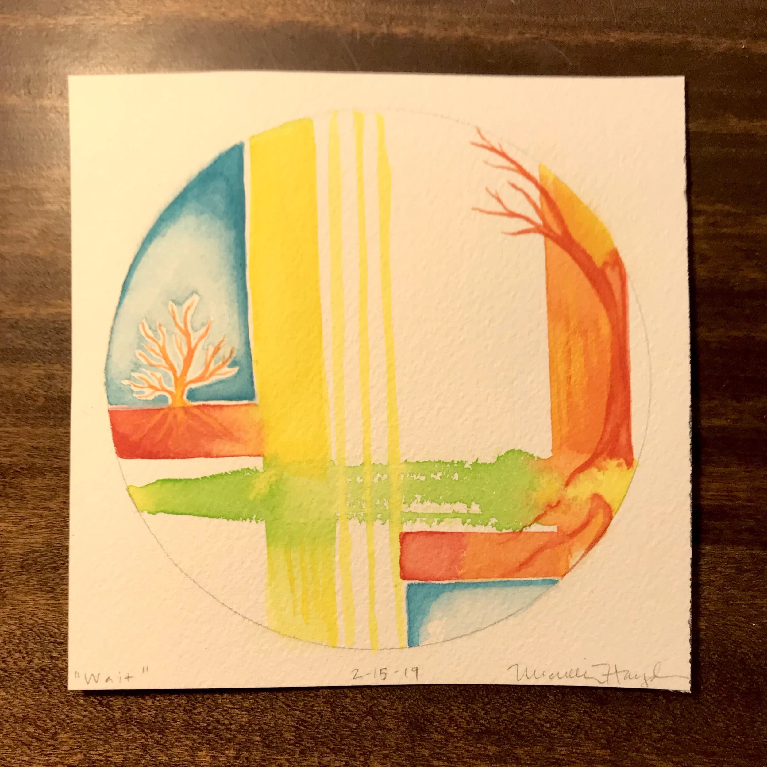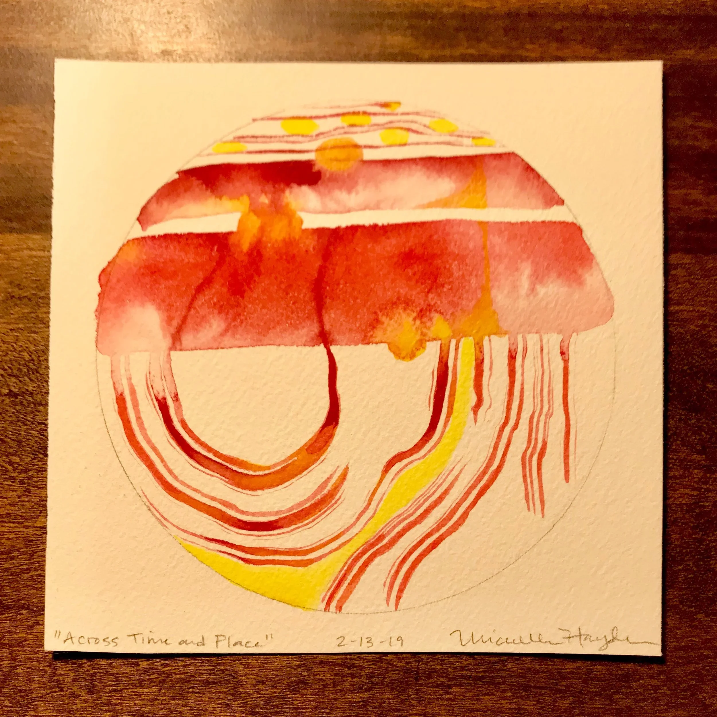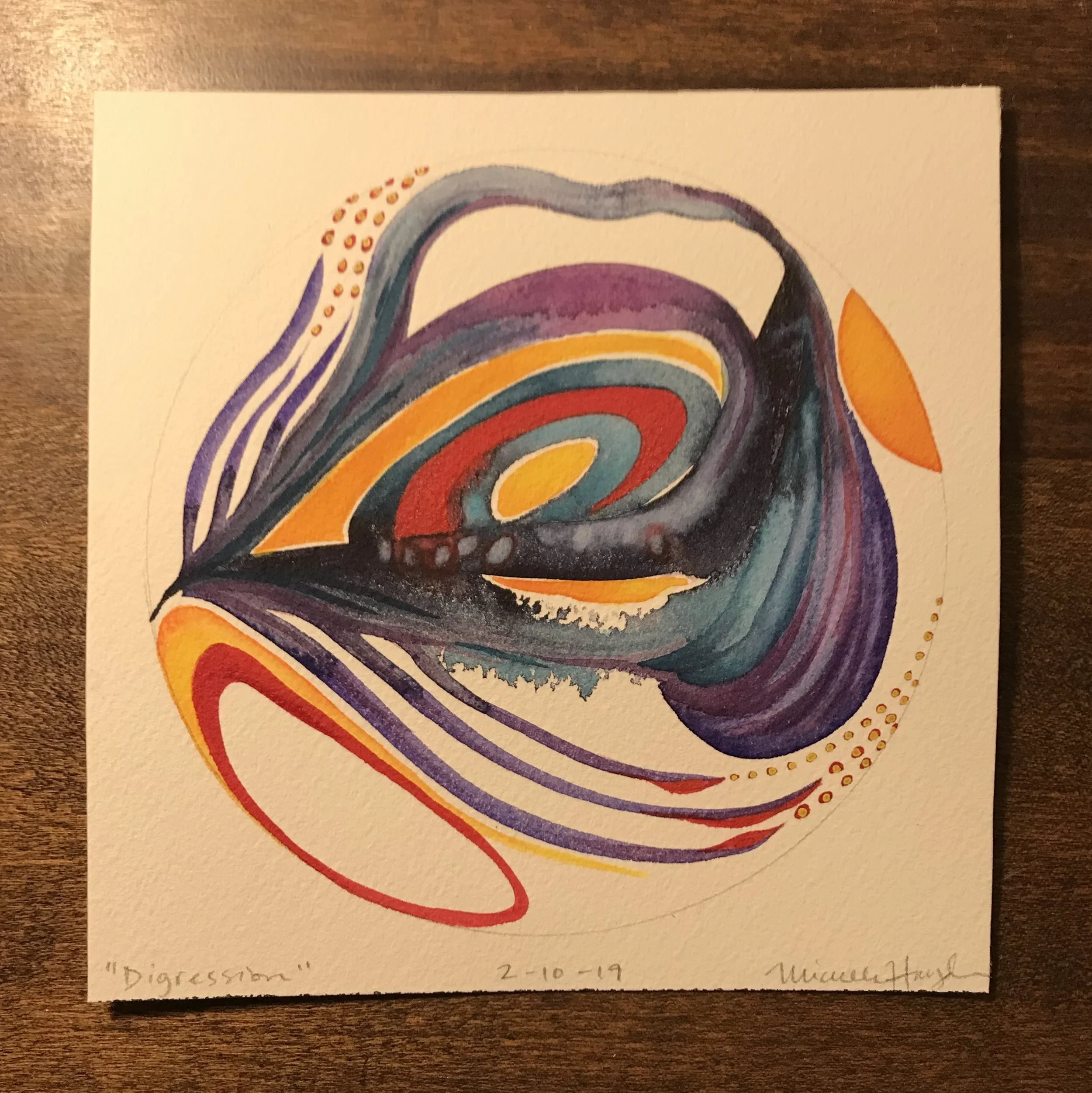 “What was intended as a quick and simple circle ended up being one which became more layered by the minutes that began to pile past the hour. As I continued to see (somewhat agitatingly) the sky lighten, my mind became more and more distracted by the remembrance of the pan of brownies laying on the counter in the kitchen, leftover from the dear visit from my sister and her spouse yesterday. It started to feel comical that my focus turned to what lay ahead rather than what was in front of me, yet neither would go away, haha. Thankfully, my brush water became so dark that it had to be dumped and renewed, and the sink just happened to be near the pan of brownies, and I may have just taken a bite or two, which enabled the completion of the circle when I returned. Such simple plans made more enjoyable by simple pleasures...”