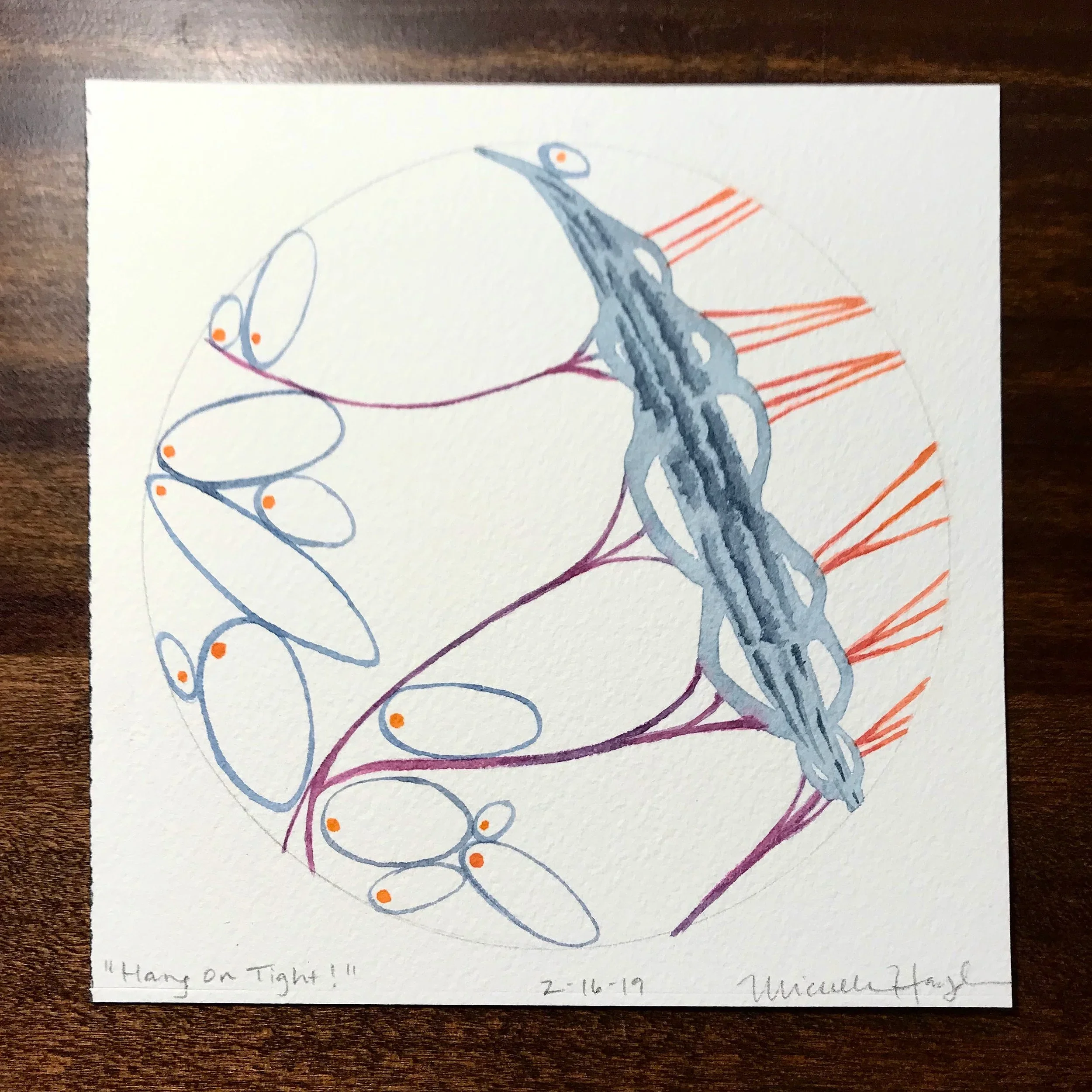 “Except to paint with minimal line and shading, these forms landed on precarious parts of the page without expectation. Suspended in mid-air, they appear to be on a journey. Not sure where we are going at times, we hang on tight, trusting the process as it unfolds... (although looking at the painting again, they actually look quite relaxed and gently held as they are carried forward— points to ponder!). “