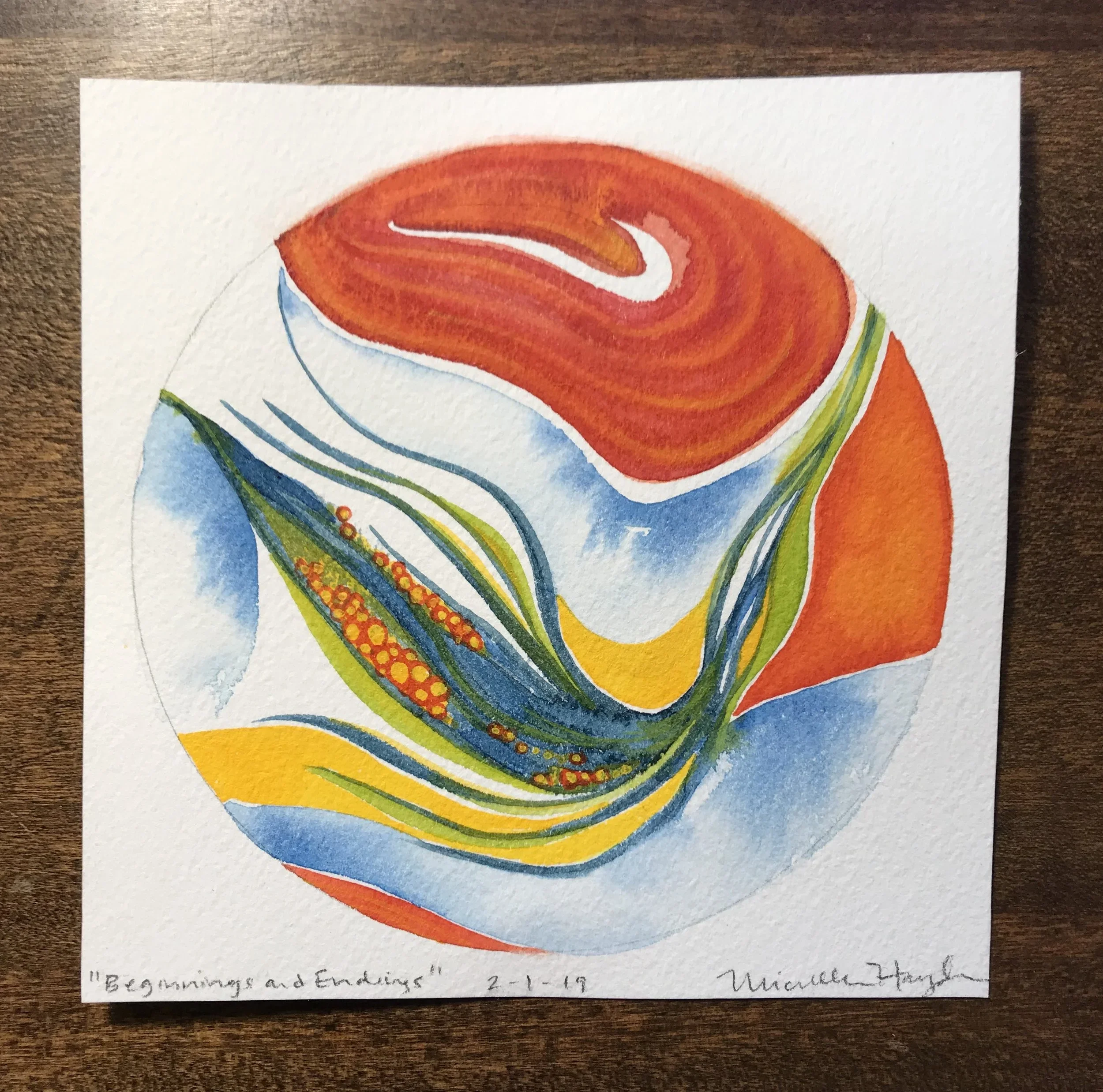 “As we begin this month of February, I am reaching a landmark month. At its completion, I will have painted a circle for every day of the past year. It has given me much more than I can express here today... and yet as powerful as the experience has been, it has been at least as challenging, and I know that my energy needs to turn to other parts of my life and the growth of my art. I will continue to paint circles and to share, although with the release of parameters for myself on how and when to do so. I very much value the connection and sharing with all of you that has already taken place and look forward to continuing the flow as new paths emerge. Who knows how these circles will expand into open space? I realize as I write those words that it is trusting the process that is most important for me, coming full circle to where I began in this daily meditation.”
