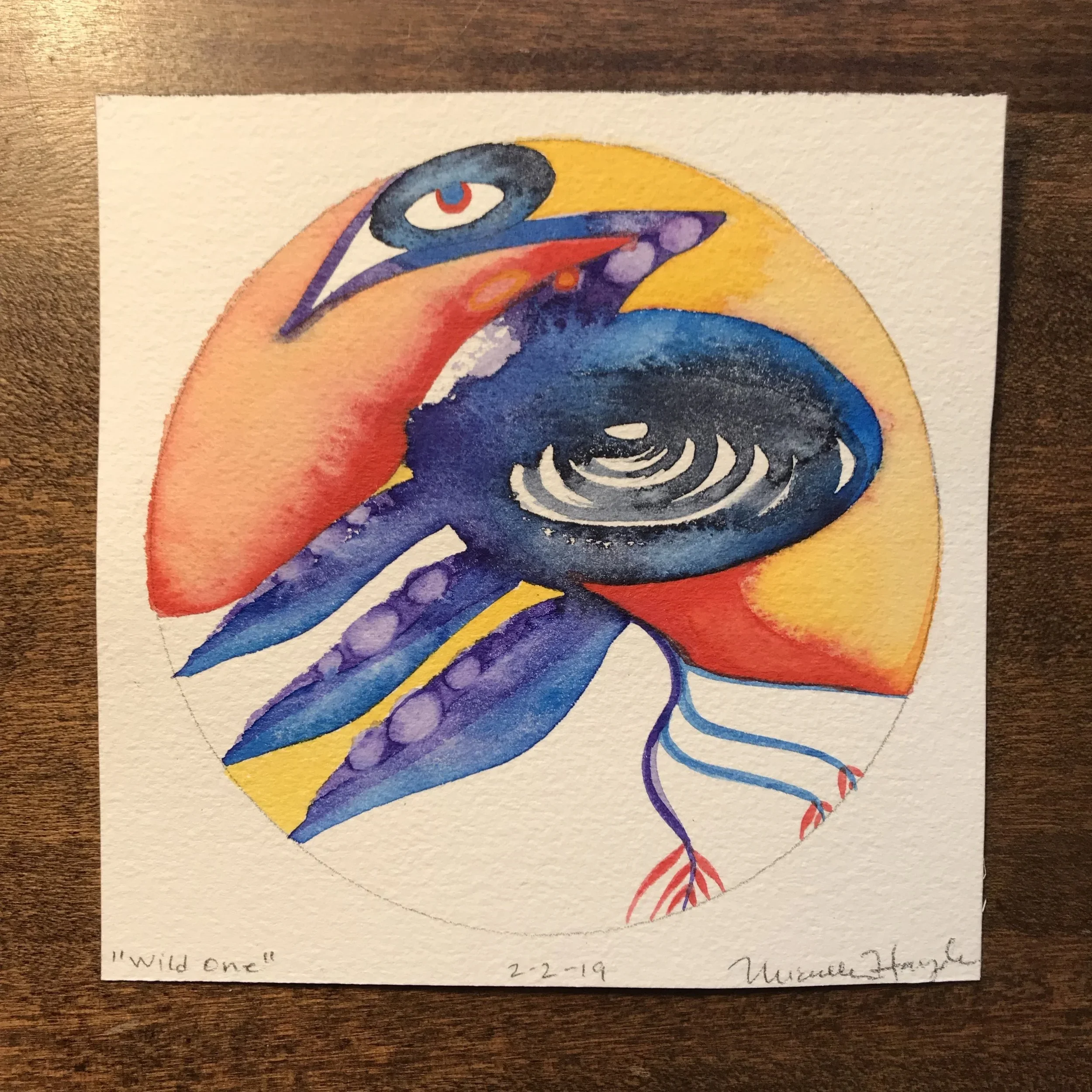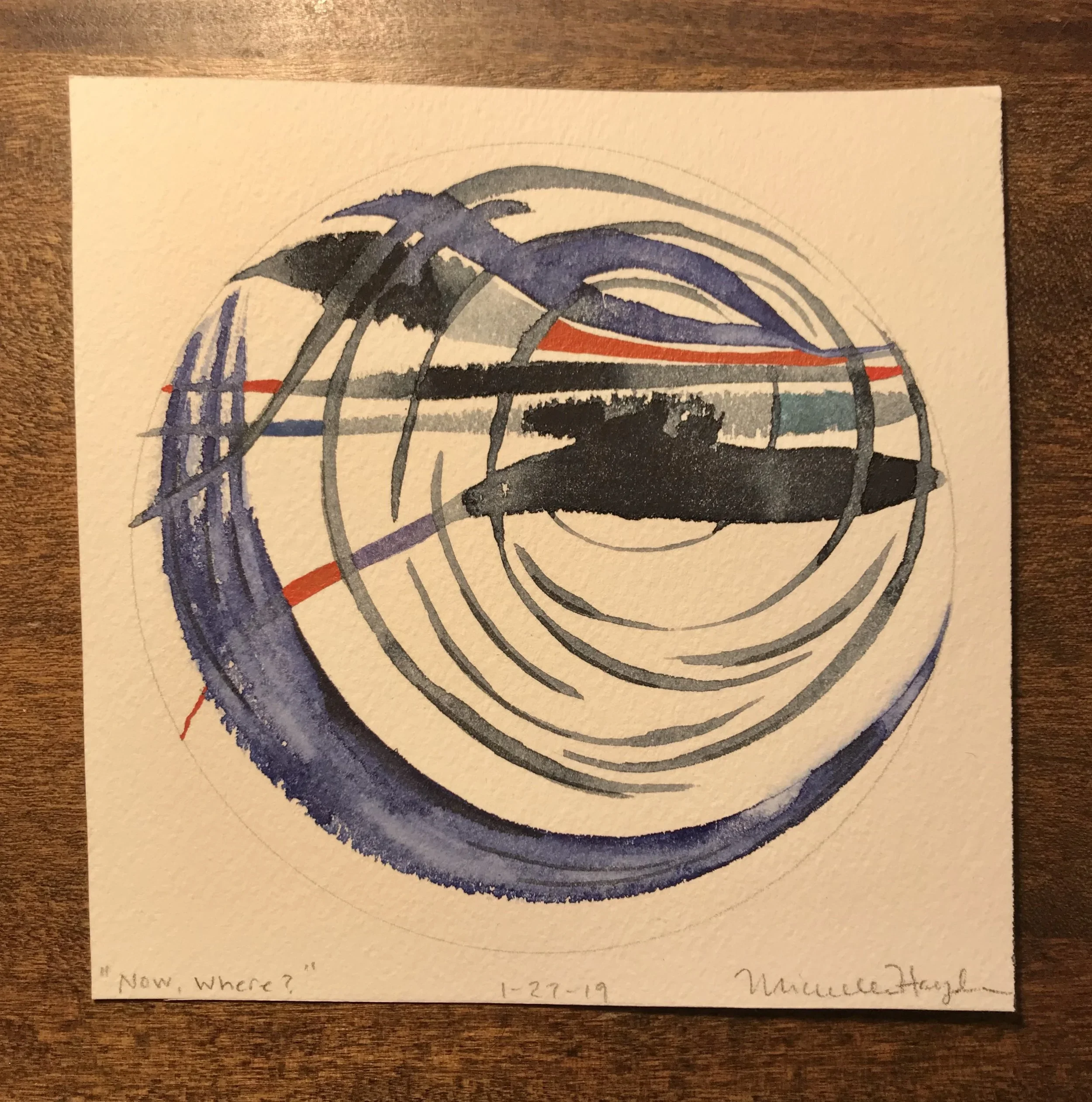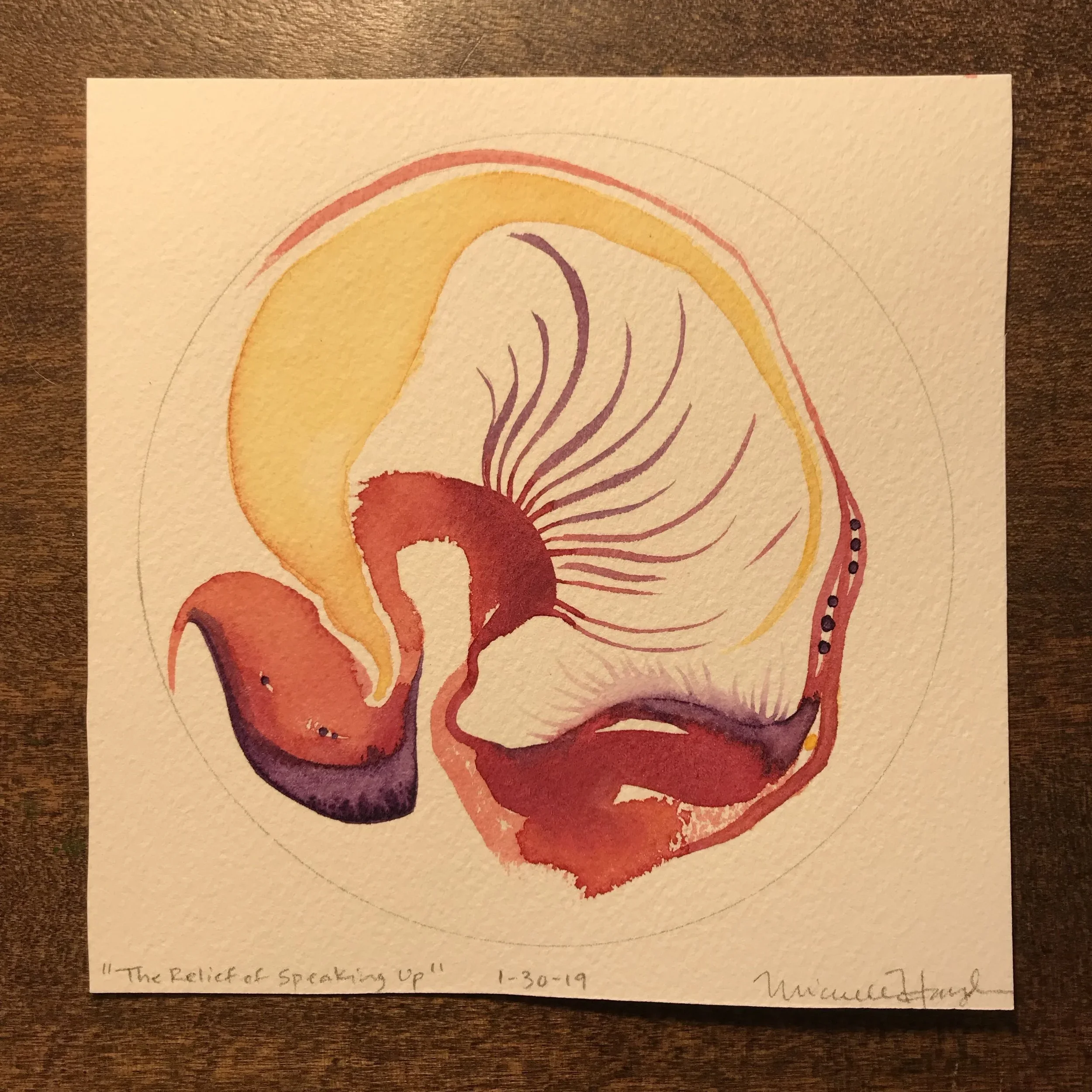 “An integral part of yesterday’s intention, this one appeared on the wonky warped watercolor paper— relief at using my voice. As I have written before, this has been decades in the making, and continues to be a work in progress. I intentionally used the word “relief” in the title to remind myself that speaking when I need to speak results in change, at least inside myself, each and every time I can do so. May we all find empowerment use our voices!”