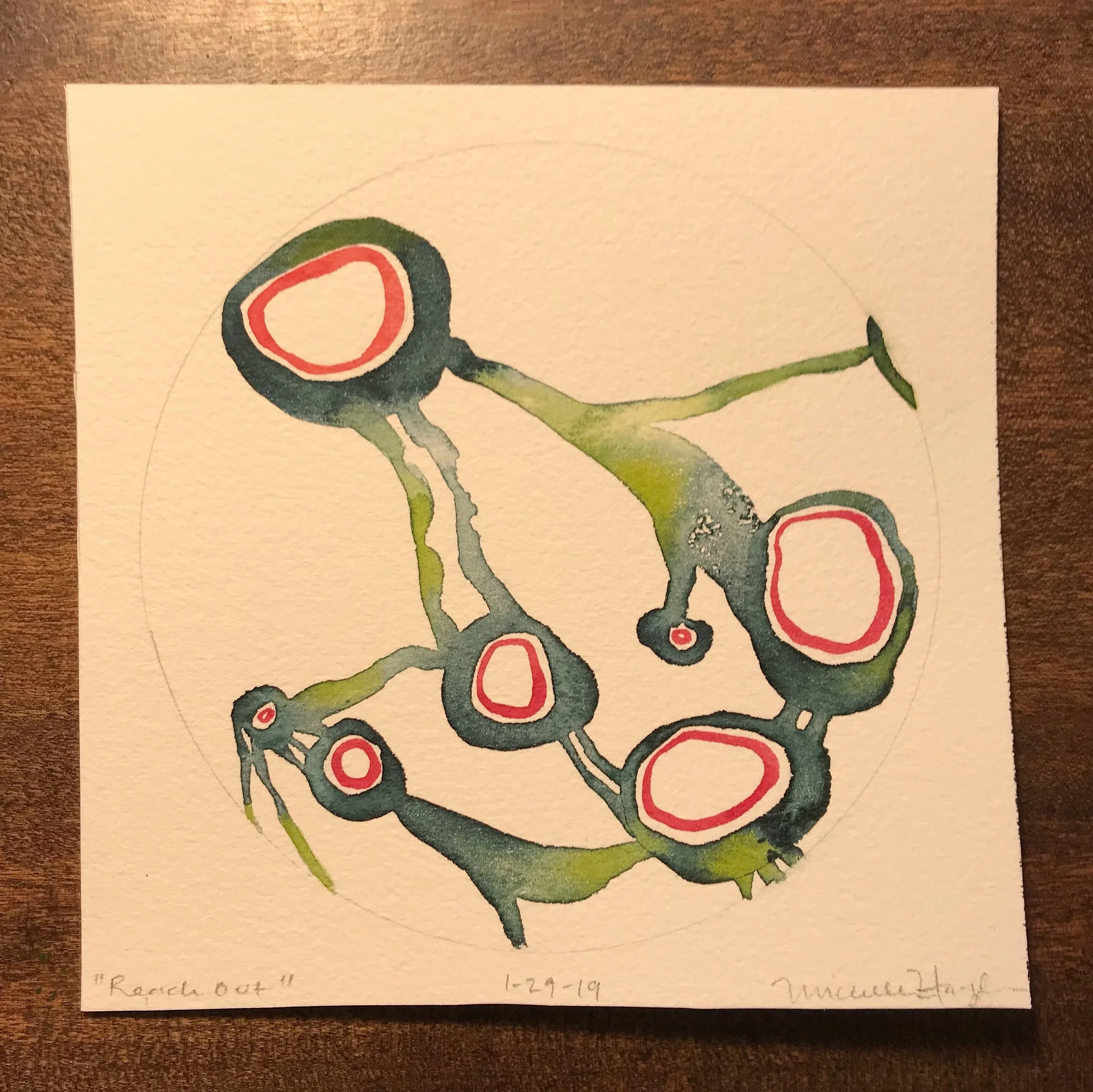 “This morning’s organic forms reflect an intention I am working on— reaching out when I need help. It sounds like such a basic task... something we teach our children from a young age. Yet for most, I would dare to say, it is not easy at all. I have asked for more help than usual lately and I must declare, it feels surprisingly good, despite the angst in the asking. And the bonus part is that those asked have shared that it makes them feel good, as well, closing the circle of exchange with positive energy and reinforcing that the sky will not fall, but open...”