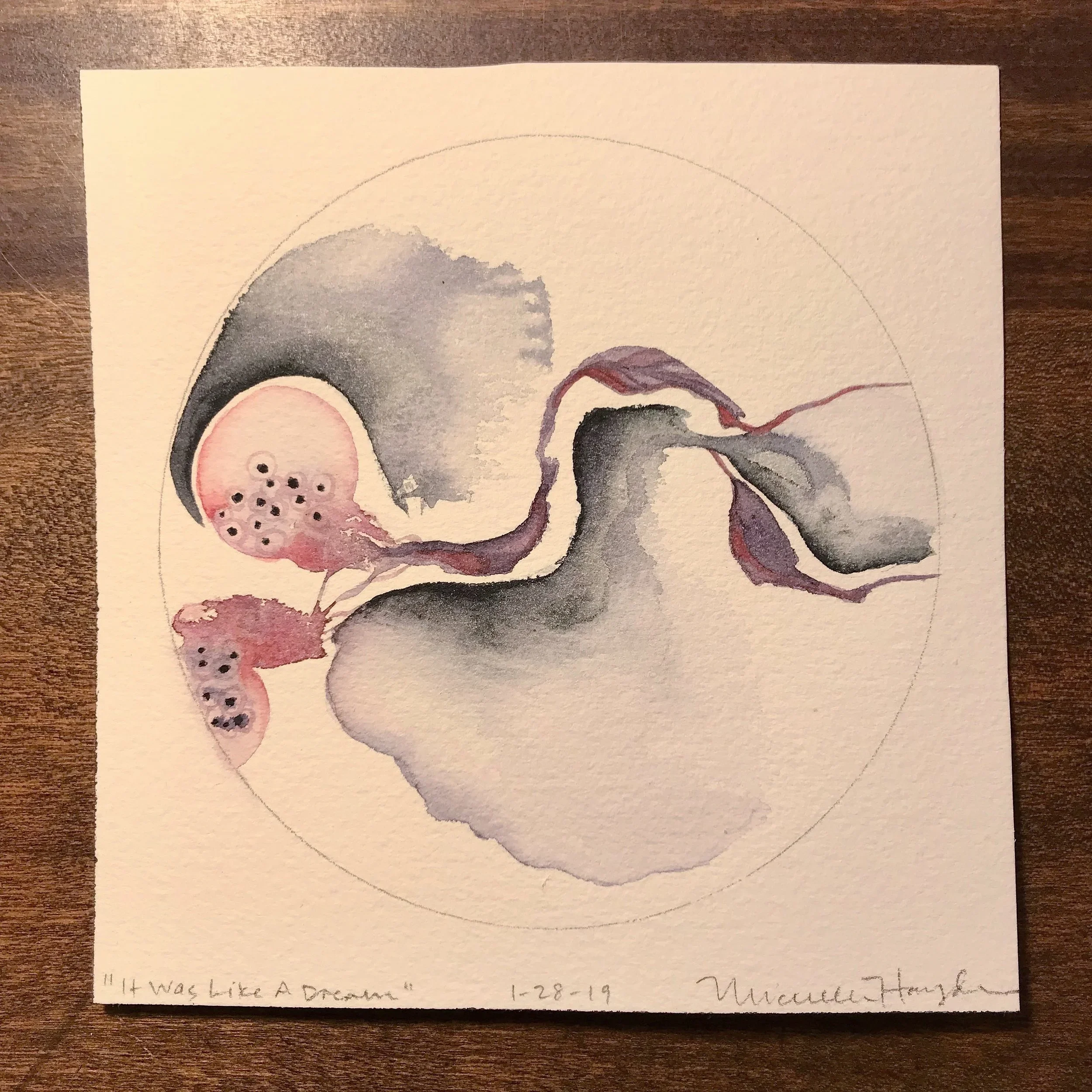 “The colors that merged here came from remnants in my paint pan, swirling together much like pieces of the day and life that end up in my dreams. It is interesting, at times, to interpret and find meaning in dreams, and at other times, to let them be, knowing they are part of us that we do not control. I am grateful for creativity of all kinds that brings us in touch with this loosening of mind.”