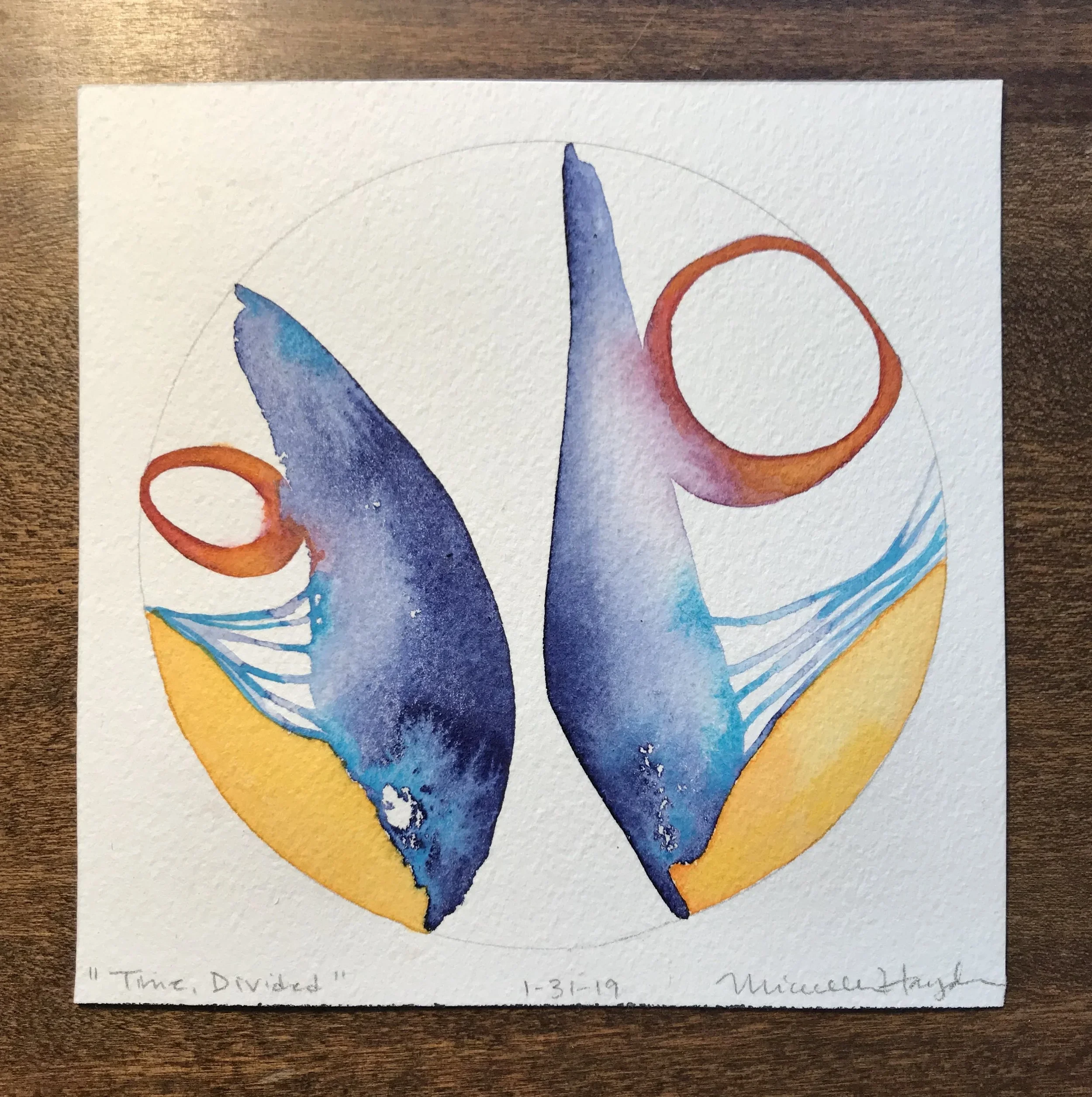 “Having returned from being on the road the last three days, I was especially happy to wake up in my own bed and sit at my desk to paint, a familiar view coming into focus through the window in the early light... This morning’s circle speaks to me of the ongoing challenge of balancing time, aware that our growing children’s moments with us shorten by the day while the dedication needed for my art runs alongside. Both leave me constantly trying to catch up, but fill me with abundant gratitude for the sacred roles they play in my life.”