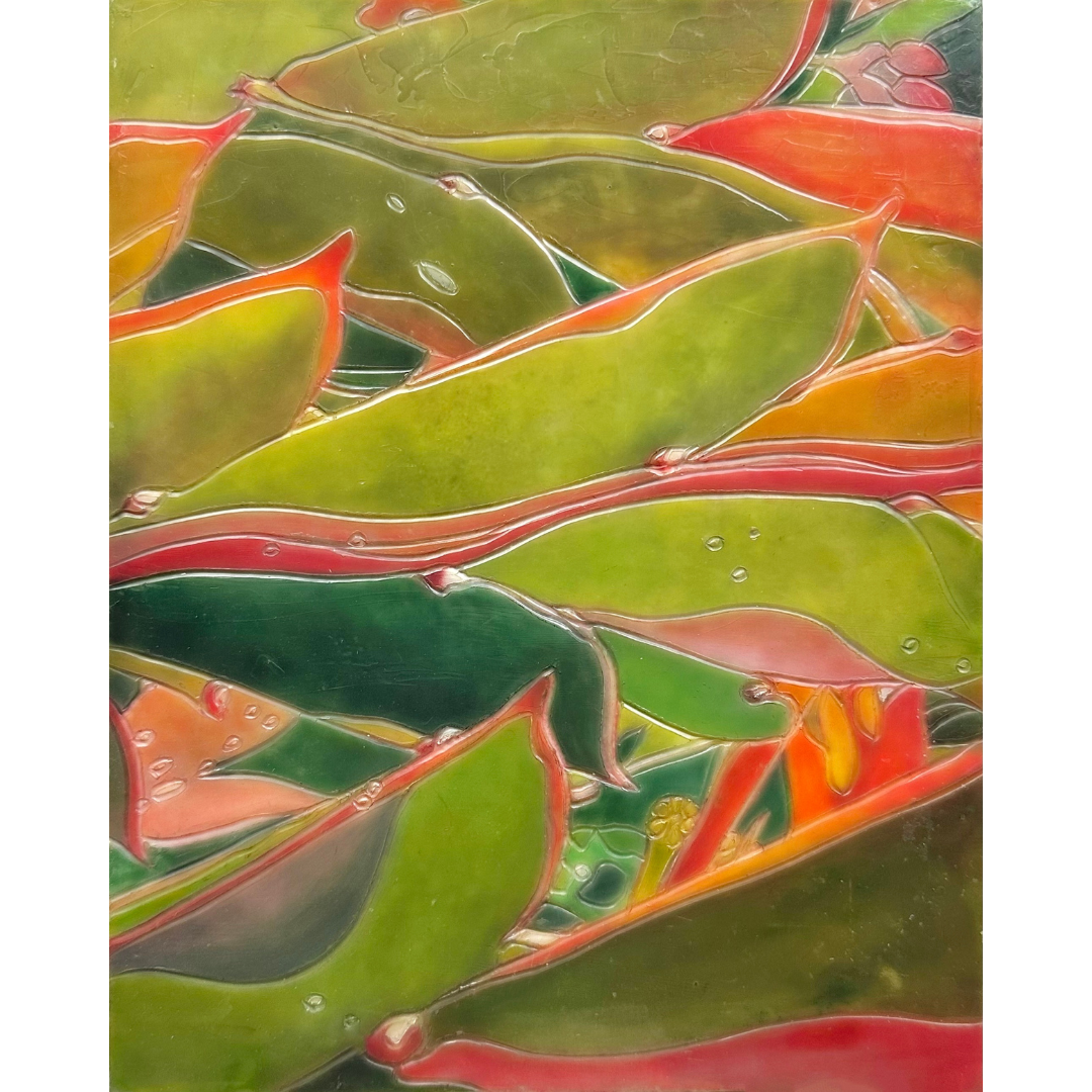 “Gently Flow" depicts one of my favorite plants with its orderly-patterned and saturated warm-colored leaves, and was a joy to carve and interpret in wax! This image was printed onto archival paper, layered with encaustic medium, fused between every layer, hand-carved to create rhythm and detail, and colored with powdered pigment to convey my experience of being with this otherworldly specimen of nature.